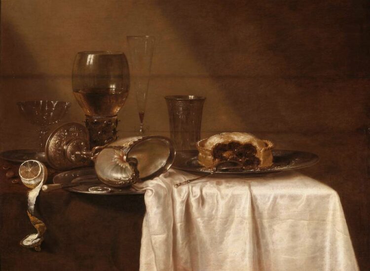 Les natures mortes de Willem Claesz. Heda consistent presque exclusivement en d’austères collations, ici un repas interrompu. L’art de Heda est fondé sur l’harmonie des gris (argenterie) et des blancs (nappe et verres) relevée par une touche plus colorée : le jaune d’un citron entamé par exemple. L’effet est produit par un raffinement des valeurs, des demi-teintes, des transparences sur un seul ton.
