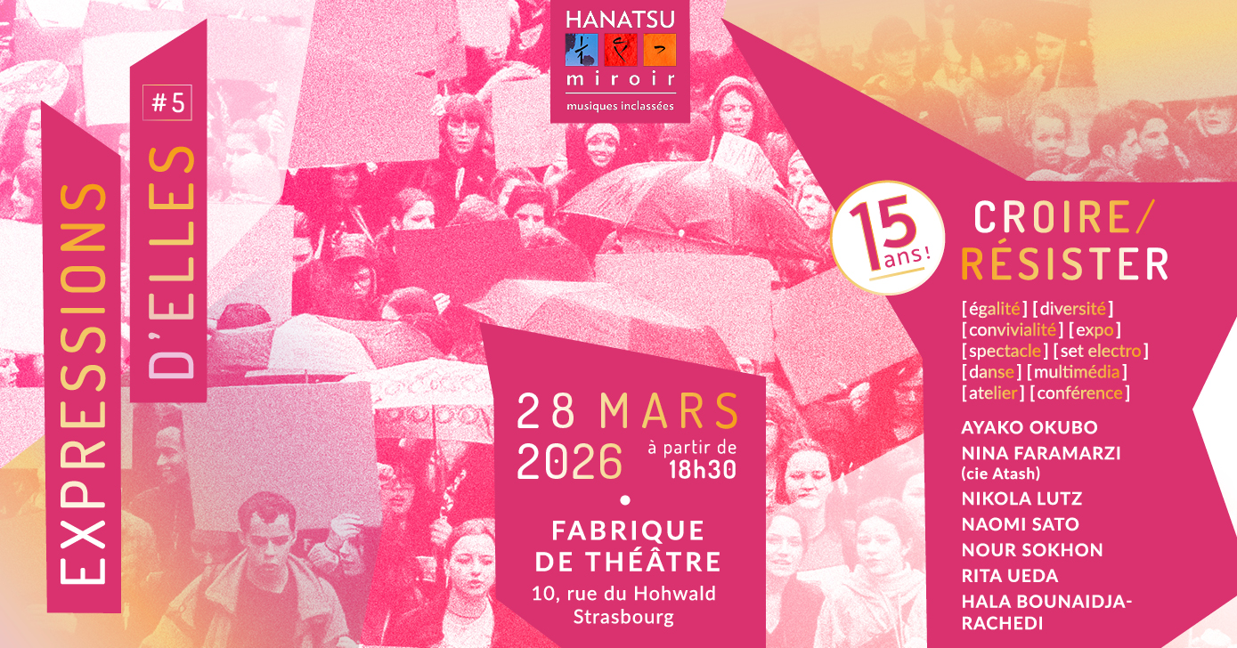 HANATSUmiroir propose une nouvelle édition de son MiniFest Expressions d’Elles, qui œuvre pour l’égalité de genre, lutte contre les discriminations, promeut la diversité et l’adelphité, avec pour point de départ le combat pour la reconnaissance, le respect et l’application des droits des femmes. Cette année, l’événement interroge l’action de Croire/Résister. Quels souhaits et quelles inquiétudes avons-nous pour l’avenir? Quel est notre rapport au monde, à l’humanité ? Quel espoir mettons-nous dans la solidarité humaine? Comment rassembler femmes et hommes au sein d’une lutte commune pour la paix, la liberté, l’égalité et la diversité? Un sujet actuel ancré dans les luttes contemporaines qui prendra vie sur scène à travers une création audiovisuelle conçue par Ayako Okubo sur la base de témoignages recueillis auprès de différents groupes de femmes. Le MiniFest offre un moment de rencontre, de partage, de débat et d’évasion, à travers les propositions artistiques de femmes engagées dans la création contemporaine et expérimentale, à l’image des compositrices et musicien·nes Nikola Lutz, Naomi Sato, Nour Sokhon, Rita Ueda, et de la danseuses et chorégraphe Nina Faramarzi (cie Atash).